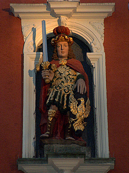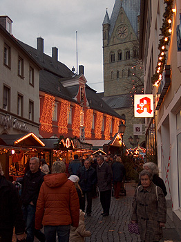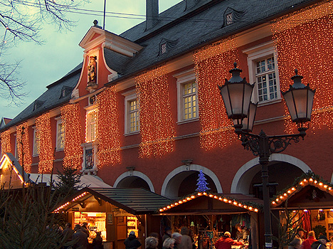 Eine ritterliche Figur weihnachtlich beleuchtet am Rathaus Soest