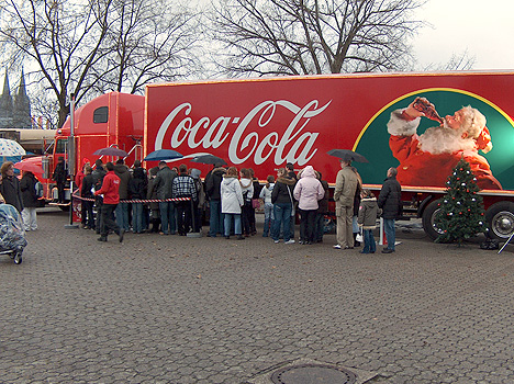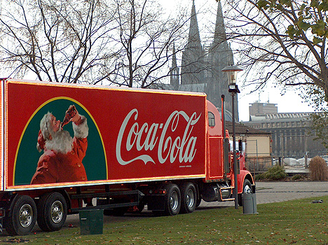 Ein Coca-Cola Truck mit Blick zum Kölner Dom