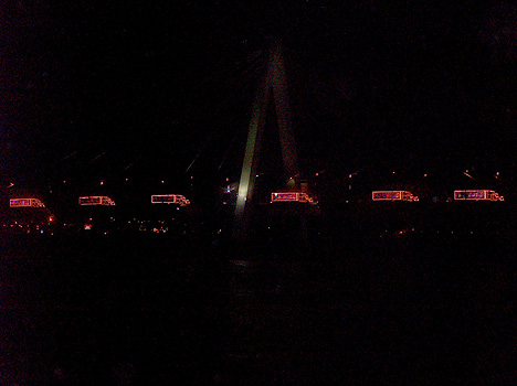 Alle 6 Trucks fahren beleuchtet über die Severinsbrücke von Köln