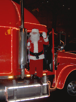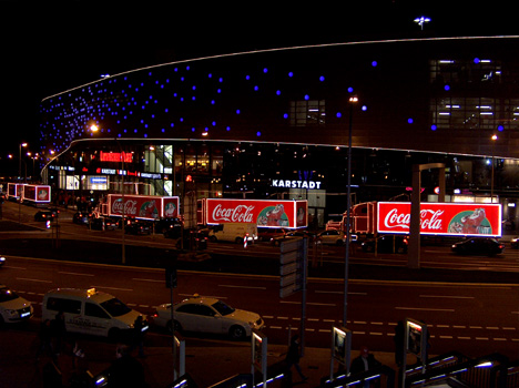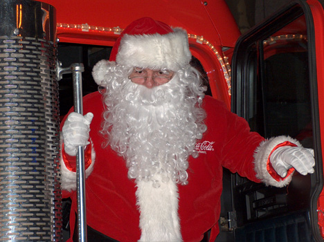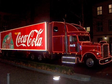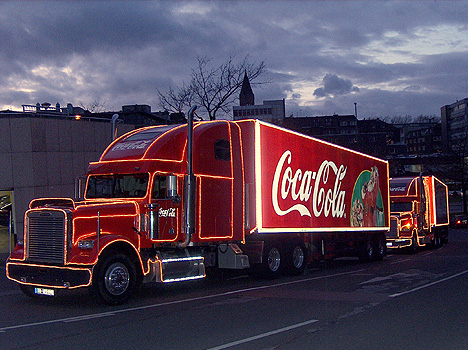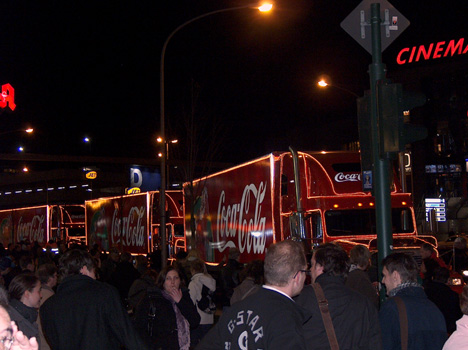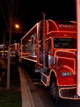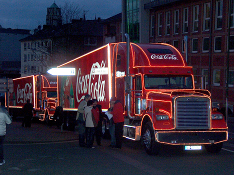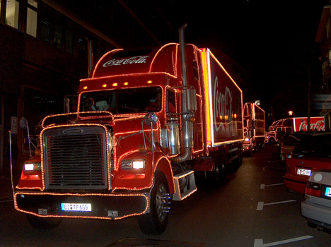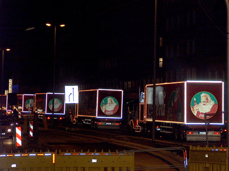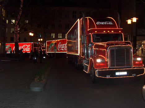 Die fünf beleuchteten Coca-Cola Weihnachtstrucks fahren langsam ...