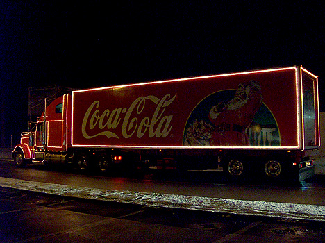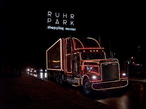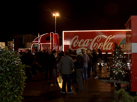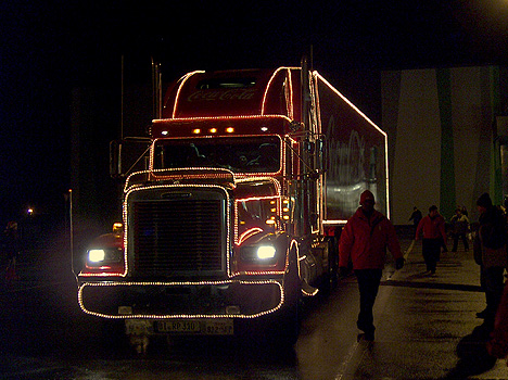 Der beleuchtete Coca-Cola Weihnachtstruck fährt los ...